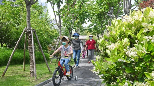 6月15日,在合肥市廬陽經(jīng)濟開發(fā)區(qū),工作人員駕駛灑水車清潔路面。