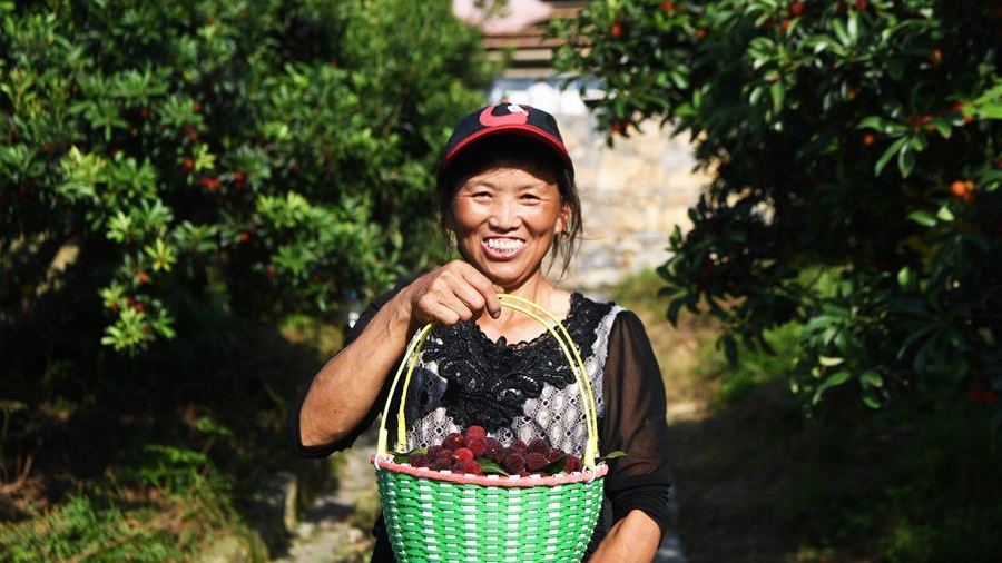 6月4日,工作人員在燕山鄉(xiāng)泉水村楊梅基地展示剛采摘下來(lái)的楊梅。