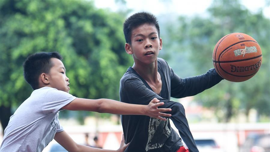 圖為6月4日,張家城在體育課上練習(xí)上籃(無(wú)人機(jī)照片)。