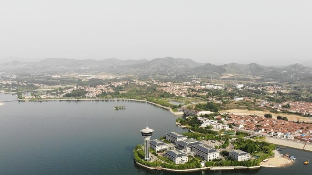 山東濟南風景區(qū)——雪野湖波光粼粼,岸邊綠樹環(huán)抱。