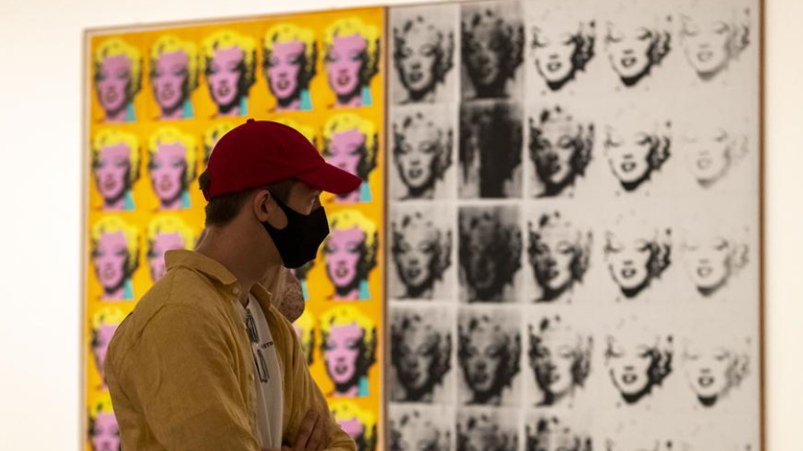 8月1日,觀眾在英國倫敦的泰特現(xiàn)代美術館觀看安迪·沃霍爾的作品。參觀者需提前網(wǎng)上預約參觀時段,并全程佩戴口罩且保持安全距離。