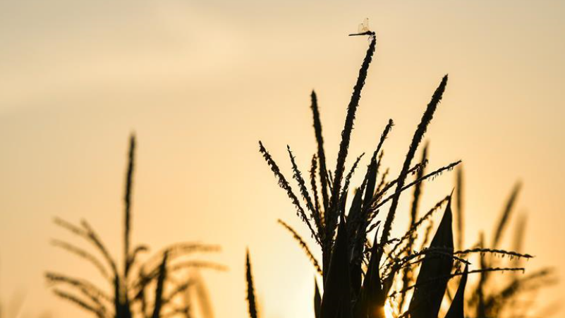 在吉林省梨樹縣國家百萬畝綠色食品原料(玉米)標準化生產(chǎn)基地核心示范區(qū),一只蜻蜓停靠在一株玉米上(7月23日攝)。