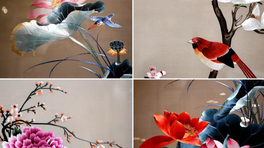 在開封市素花宋繡工藝有限公司的展示館里,王素花向徒弟劉冬紅講解刺繡作品上的難點(7月30日攝)。