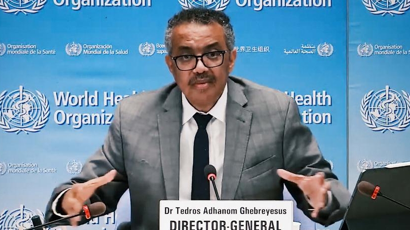 這是8月6日在比利時布魯塞爾拍攝的世界衛(wèi)生組織總干事譚德塞在瑞士日內(nèi)瓦出席線上記者會的視頻畫面。