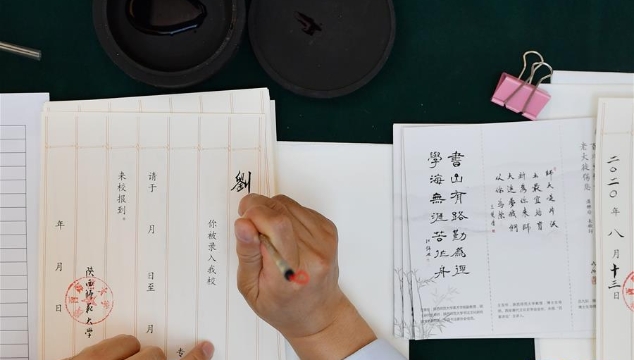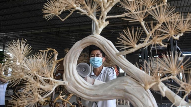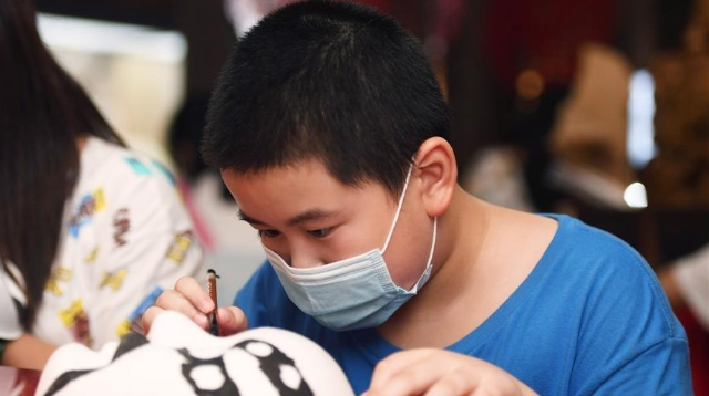 8月5日,侯景偉在葫蘆上進行創(chuàng)作。經(jīng)過多年潛心研究,他將浮雕和烙畫工藝相結(jié)合,通過拋光、起稿、雕刻、烙燙、套色等十余道工藝,制作展現(xiàn)傳統(tǒng)文化、民俗故事的葫蘆工藝品。