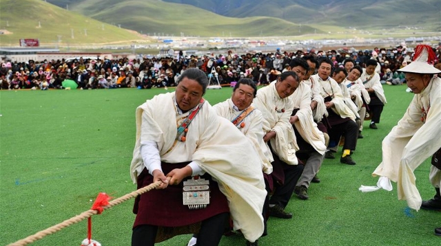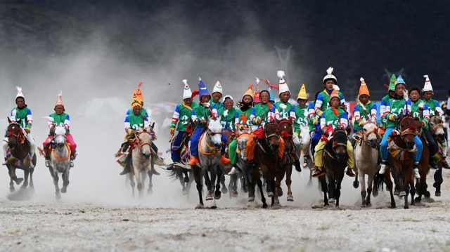 8月12日,2020中國碌曲鍋莊舞展演暨甘南藏族自治州第六屆少數(shù)民族傳統(tǒng)體育運動會在甘肅省甘南州碌曲縣夏澤灘草原上舉行。開幕式上,三千余名身著節(jié)日盛裝的演員和當?shù)厝罕娫诓菰掀鹞?,雨后初晴的草原上充滿歡聲笑語。