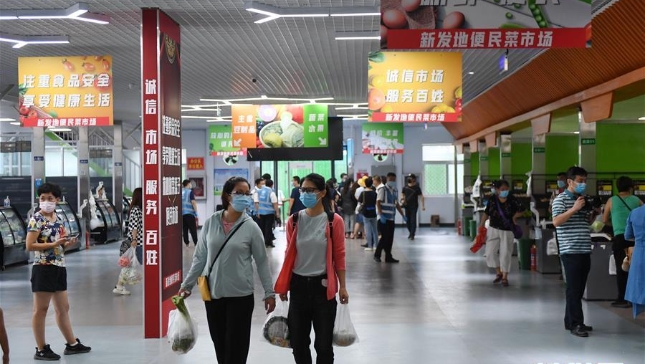 工作人員在新發(fā)地批發(fā)市場周轉(zhuǎn)新區(qū)對進場車輛進行取樣。