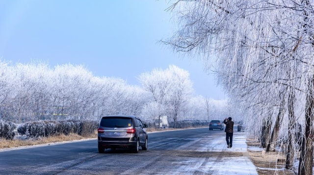 1月13日,霧散日升。河北省邢臺市大街小巷的樹枝上掛滿了潔白晶瑩的霜花,藍天下微風吹拂銀絲閃爍,奇麗壯觀。