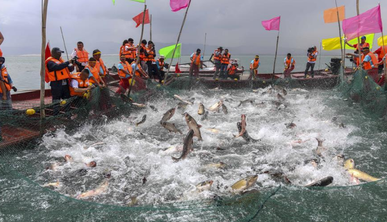 2019年7月9日,漁民們在江蘇連云港沿海地區(qū)海邊的灘涂上將剛收獲的海蟶運(yùn)送上岸裝箱外運(yùn)。