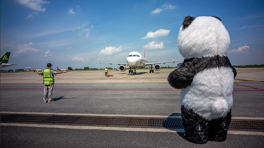 2020年8月5日,江蘇揚(yáng)州,工作人員在揚(yáng)州泰州國際機(jī)場將大熊貓搬運(yùn)出機(jī)艙。