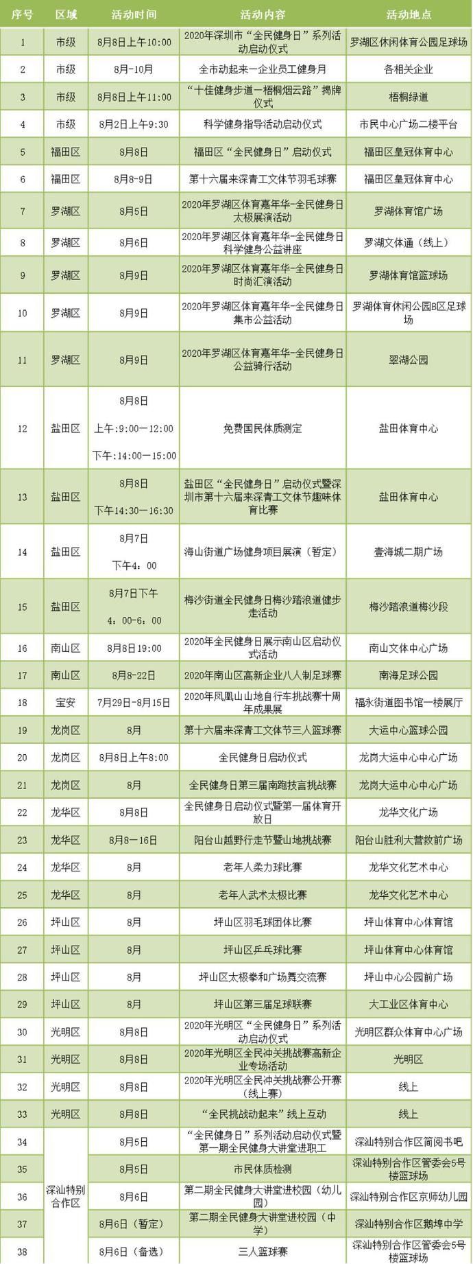 在啟動當(dāng)日,全市各區(qū)也同步聯(lián)動,啟動了“全民健身日”系列活動。即日起至8月10日,深圳將陸續(xù)推出近40項全民健身運動系列活動,內(nèi)容涵蓋來深青工文體節(jié)、企業(yè)員工健身月、體育嘉年華系列展演、全民沖關(guān)線上挑戰(zhàn)賽、足球、籃球、老年太極、柔力球、國民體質(zhì)測定、全民健身大講堂、健身步道健步行等。此外,全市各公益體育館也將面向市民免費開放,大家可關(guān)注各場館進行預(yù)約。