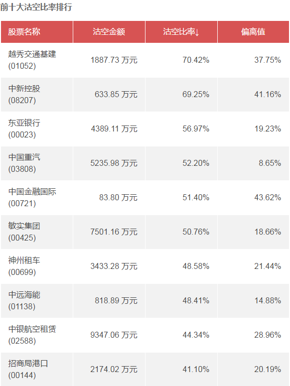 智通財經(jīng)APP數(shù)據(jù)顯示,越秀交通基建(01052)、中新控股(08207)、東亞銀行(00023)上一交易日沽空比率位于前三位,分別為70.42%、69.25%、56.97%。