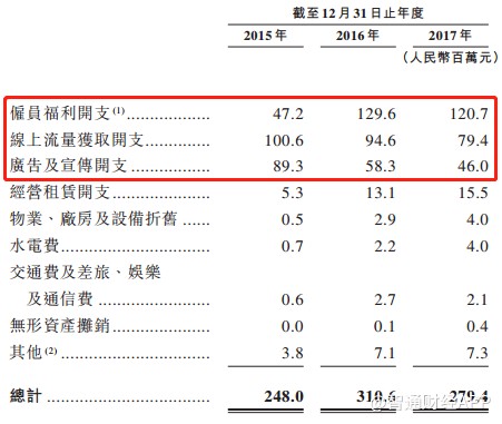 土巴兔的銷售人員開支從2015年的4720萬元大幅增至2016年的1.29億元,并在2017年維持1.2億元左右高位。不過隨著公司規(guī)?;\營的展開,公司線上買量開支卻從1億元降至7940萬元。