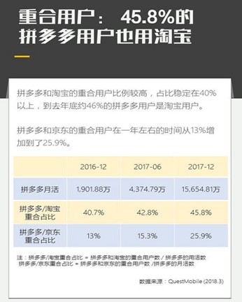 從用戶分布來看,據(jù)企鵝智酷發(fā)布了《拼多多用戶研究報(bào)告》,拼多多的一線城市用戶,實(shí)際上只比淘寶低了2個(gè)百分點(diǎn);2017年底,有46%的拼多多用戶同時(shí)也是淘寶用戶,是所有電商平臺中最高的;拼多多和京東的重合用戶,一年內(nèi)增長了一倍。