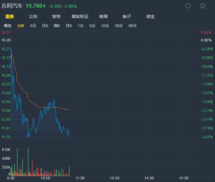 截至發(fā)稿,吉利報(bào)15.7港元,跌3.08%。(文文)