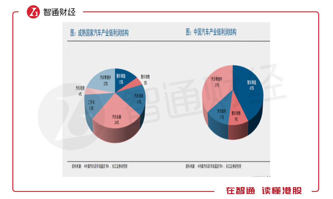 在港股上市公司中,汽車經(jīng)銷商主要銷售的均為進口豪華車型,比如奧迪、奔馳及寶馬車型,主要還是國內(nèi)的自主品牌制造商有自己專門的銷售渠道。整體來看,銷售環(huán)節(jié)利潤率一般都不高,凈利率賺個售價的3-5個百分點左右。汽車后市場龐大,但目前市場較為零散,還未形成較大規(guī)模的企業(yè)。