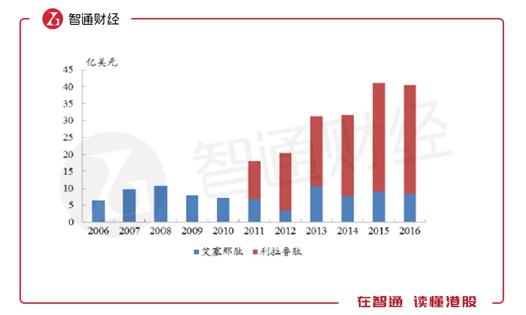 從2005年發(fā)展至今,全球已有6種GLP-1受體激動(dòng)劑相繼獲批上市,整個(gè)GLP-1受體激動(dòng)劑類藥物的全球市場(chǎng)規(guī)模已超過(guò)40億美元,2011-2016年的復(fù)合增長(zhǎng)率超過(guò)15%。而艾塞那肽作為最早上市的GLP-1類似物,上市后銷(xiāo)售額快速增長(zhǎng),早在2008年就突破10億美元。