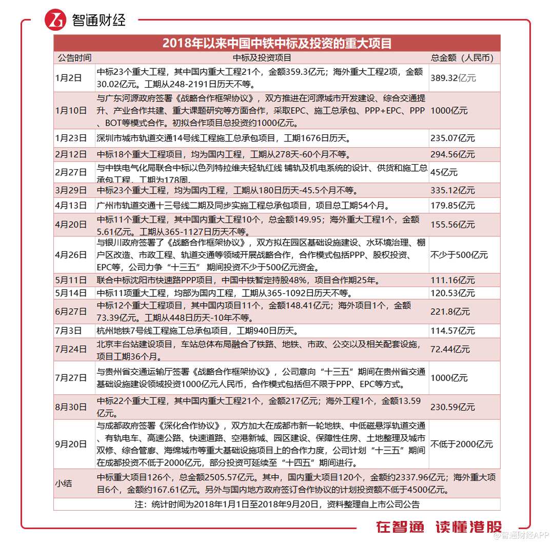 智通財(cái)經(jīng)APP注意到,雖然新簽合同金增速放緩,但中標(biāo)的重大項(xiàng)目卻大幅增加。據(jù)披露,中國(guó)中鐵上半年中標(biāo)的重大工程項(xiàng)目(不含與地方政府簽訂的戰(zhàn)略合作協(xié)議)達(dá)到102個(gè),而去年同期僅為49個(gè),涉及項(xiàng)目的金額更是后者的近3倍。