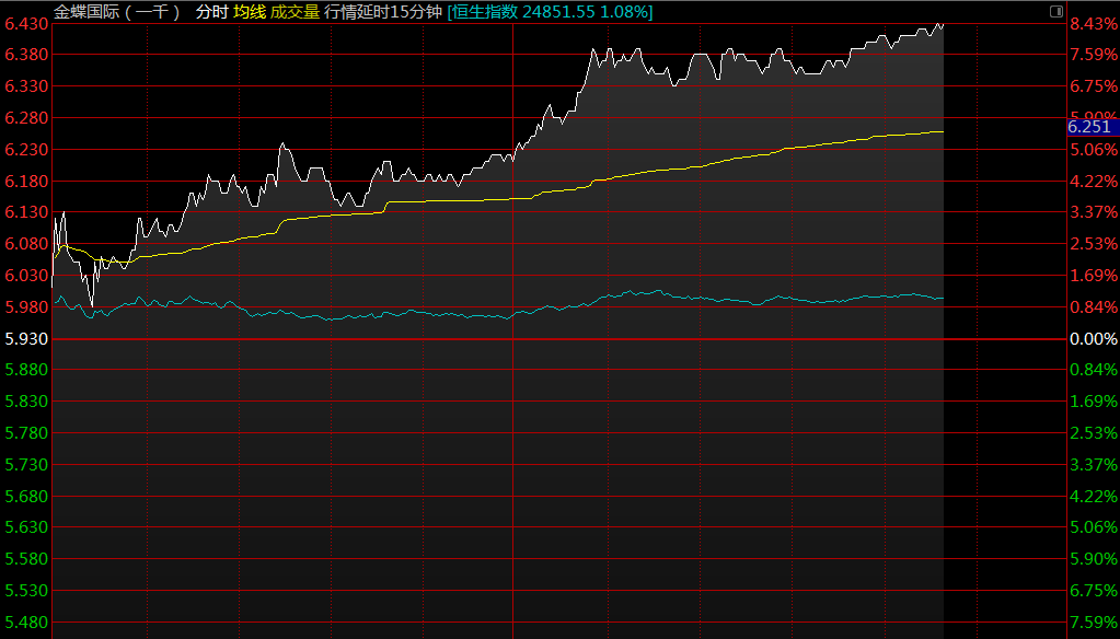 花旗首予金蝶國際(00268)“買入”評級,目標(biāo)價看高至10.1港元,午后漲幅擴(kuò)大,截至13時49分,漲7.25%,報價6.36港元,成交額2.18億。