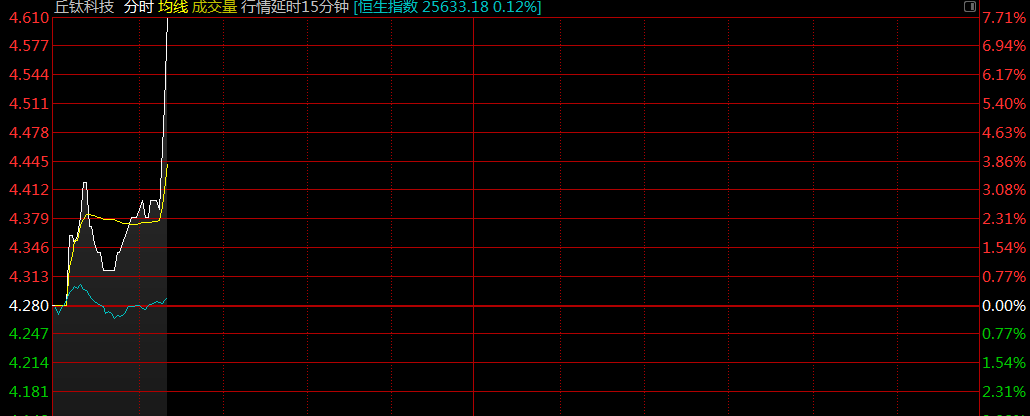 丘鈦科技(01478)今日大幅上漲,盤中漲幅超6%,截至10:22,漲7.71%,報4.61港元,成交額1069萬港元。