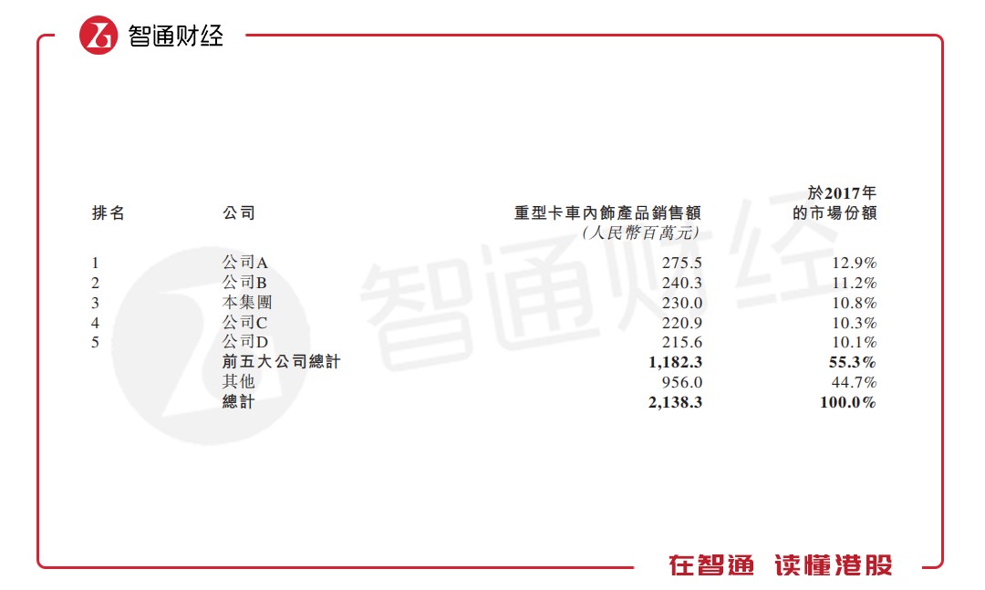 根據弗若斯特沙利文報告,按重型卡車內飾產品的銷售額計,公司是中國西北最大的重型卡車內飾產品制造商(2017年市場份額達62.7%)及中國的第三大制造商(2017年市場份額達10.8%);按汽車內飾產品的銷售額計,公司是中國西北第二大汽車內飾產品制造商(2017年市場份額達15.6%)及中國第十四大制造商(2017年市場份額達0.4%)。