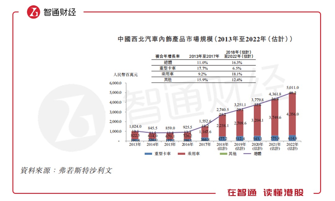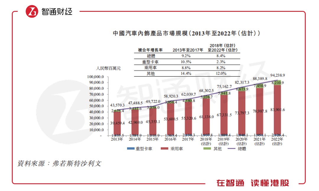 智通財經APP進一步查閱天瑞招股說明書發(fā)現,從行業(yè)來看中國汽車內飾產品市場的總值由2013年的435.7億元增至2017年的620.4億元,復合年增長率為9.2%。估計市場規(guī)模將于2022年達到942.39億元,2018年至2022年期間的復合年增長率為8.4%。
