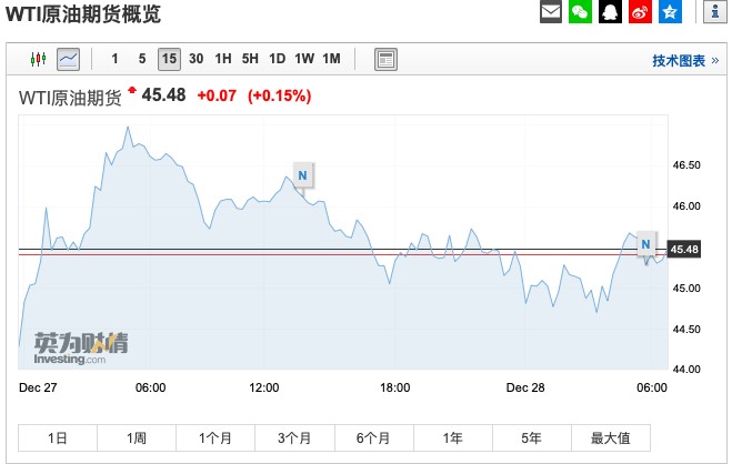 截至發(fā)稿,WTI原油漲0.07美元,漲幅0.15%,報(bào)45.48美元/桶。(劉大洋)