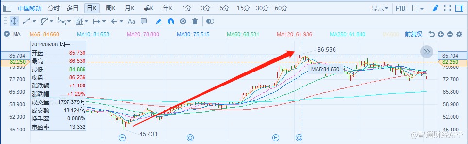 2013年12月4日,工業(yè)和信息化部正式向三大運(yùn)營(yíng)商發(fā)放了4G牌照。隨后的2014年,見證了4G前期的陣痛和后期的爆發(fā)。也在這一年,中國(guó)移動(dòng)股價(jià)上漲了21.32%。