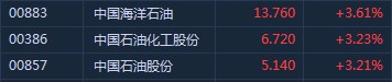 智通財經(jīng)APP獲悉,受國際原油價格持續(xù)走高刺激,港股石油股全線大漲。截至9時55分,中海油(00883)漲3.61%,報價13.76港元,中石化(00386)漲3.23%,中石油(00857)漲3.21%。