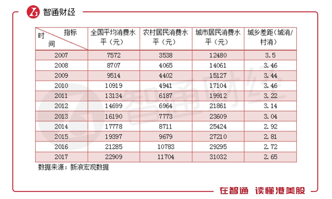 考慮到消費(fèi)能力的變化,根據(jù)新浪宏觀數(shù)據(jù),2008年農(nóng)村的消費(fèi)水平為4065元,而城市為14061元,城鄉(xiāng)差距3.46倍,不過城鄉(xiāng)差距慢慢降低了,到2017年為2.65倍,彼時農(nóng)村消費(fèi)水平為11704元,但仍偏低,相當(dāng)于城市2007年的水平。