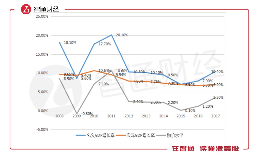 但考慮到物價水平的變化,此時農(nóng)村的消費(fèi)水平并不能代表購買力水平,智通財經(jīng)APP以實際GDP增長水平和名義GDP增長水平測算每一年的物價水平(物價水平=名義GDP增長水平-實際GDP增長水平),以下為測算圖表: