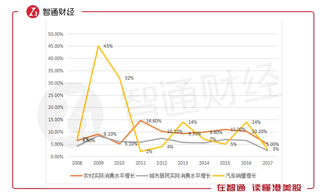 從圖表上看,消費(fèi)水平的變化跟汽車銷量增長關(guān)系度并不是很強(qiáng),特別是農(nóng)村地區(qū),比如2011年農(nóng)村消費(fèi)水平增長達(dá)14.6%,同比增加9.5個百分點(diǎn),而汽車銷量卻僅增長2%,同比下滑了30個百分點(diǎn)。但2017年這三者達(dá)成了共識,增長水平均下滑,2018年預(yù)計仍同向變動。