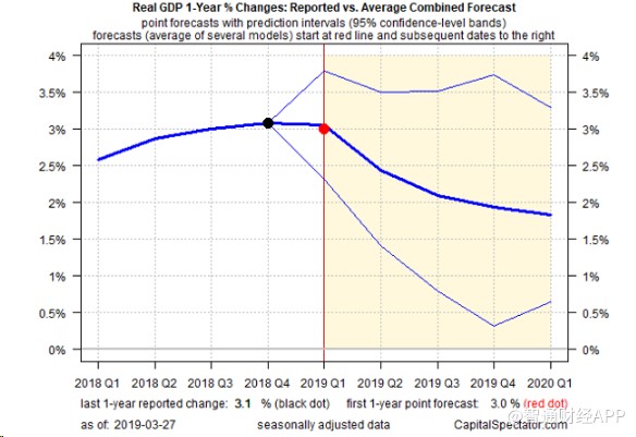 每季度更新的GDP同比數(shù)據(jù)趨勢(shì)也表明,美國(guó)經(jīng)濟(jì)出現(xiàn)下滑?!顿Y本觀察家》通過(guò)一系列綜合預(yù)測(cè)得出的平均預(yù)測(cè)值顯示,今年第一季度的同比增幅將從去年第四季度的3.1%小幅降至3.0%,并在未來(lái)幾個(gè)季度繼續(xù)走軟。如果預(yù)測(cè)無(wú)誤,這一同比增幅將出現(xiàn)自2016年第二季度以來(lái)的首次下降。