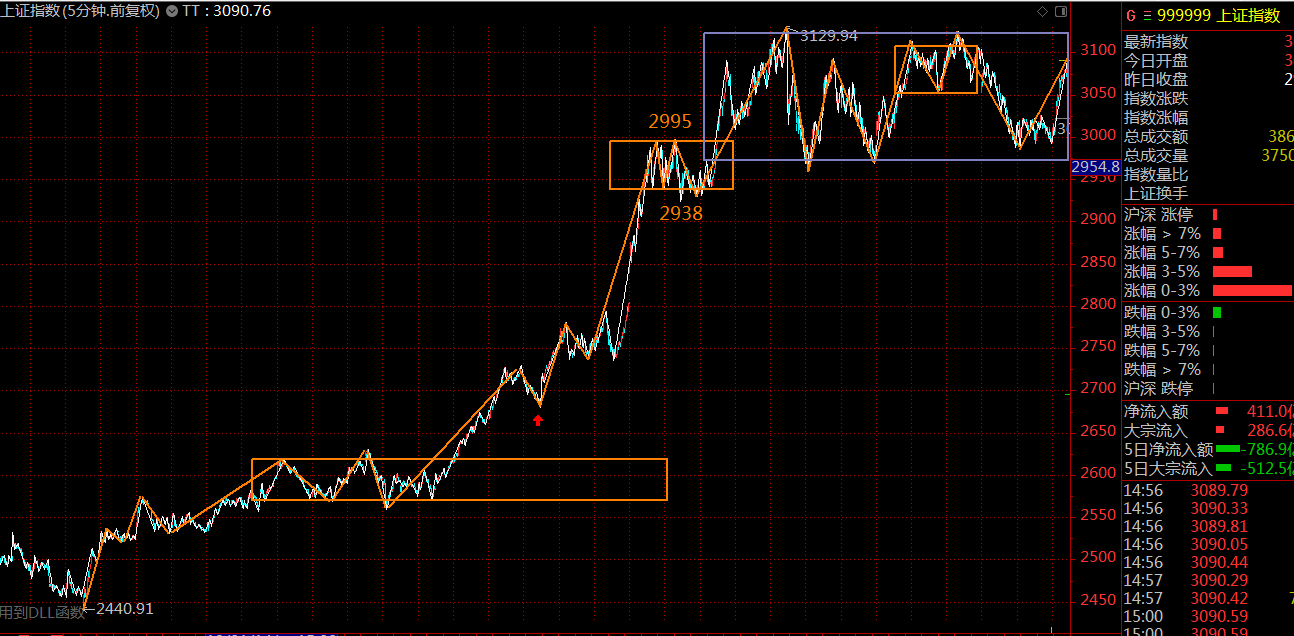 上證指數(shù)方面,這個(gè)位置的30分鐘中樞已構(gòu)建完成,調(diào)整隨時(shí)可以結(jié)束,方向選擇待定,關(guān)注30分鐘中樞上軌3125點(diǎn)壓力,30分鐘中樞下軌2968點(diǎn)支撐。就目前的市場(chǎng)情緒來(lái)看,傾向于向上突破中樞,構(gòu)建30分鐘的第三類買點(diǎn)(突破中樞上軌后,回調(diào)段不破中樞上軌)。