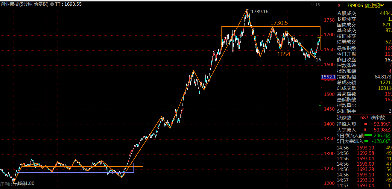 創(chuàng)業(yè)板方面,前面一段走的比較強(qiáng)勢(shì),這里僅構(gòu)建了一個(gè)五分鐘級(jí)別的中樞,整體走勢(shì)上要強(qiáng)于主板,這里還是先看中樞級(jí)別擴(kuò)展,兩相結(jié)合,下周兩市大概率會(huì)以強(qiáng)勢(shì)震蕩、蓄勢(shì)突破為主。