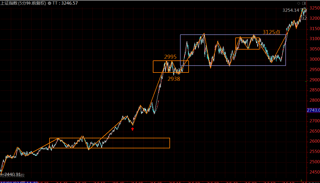 從小級別看,上證指數(shù)結(jié)構(gòu)較為清晰,上周市場突破后進入背馳段,這里隨時會回踩3125點確認。該點位若確認有效支撐,則將構(gòu)成這波上漲行情的第一個30分鐘級別第三類買點,是一個絕佳的買點。若跌回3125點,則繼續(xù)看中樞震蕩,操作方式則為在2968點-3125點之間高拋低吸,同時關(guān)注2968點支撐。3125點附近,市場將如何運行是本周市場最大的看點。