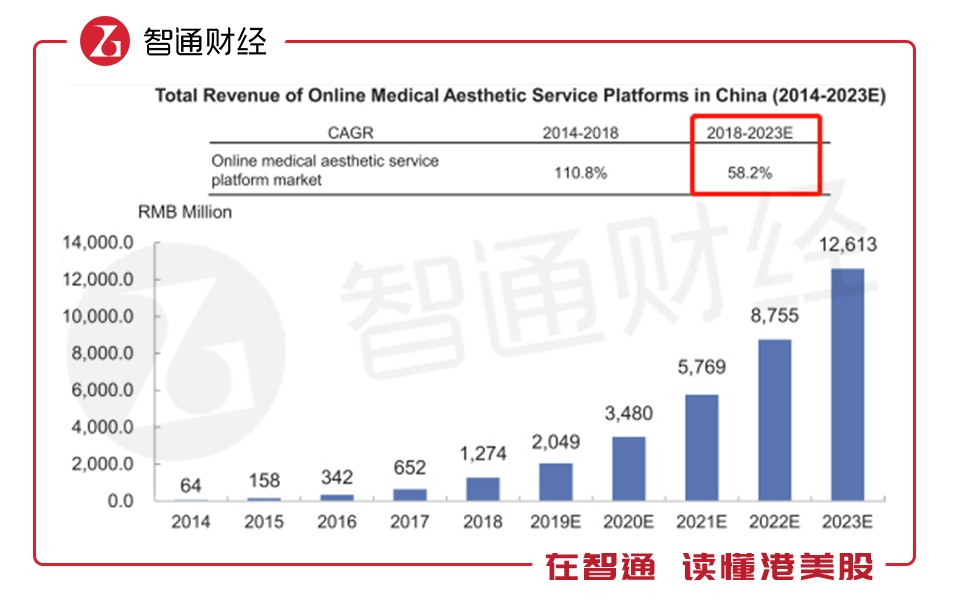 因此,近年來的線上醫(yī)美平臺憑借自身的優(yōu)勢快速崛起。從2018-2023年,線上醫(yī)美市場預(yù)計的年復(fù)合增長率為58.2%,遠快于整體醫(yī)美市場的增長速度。