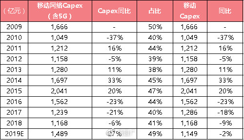 如果把三大運營商資本開支中與寬帶、傳輸網(wǎng)、支撐網(wǎng)等與移動網(wǎng)絡無關(guān)的資本開支剔除,單獨來看移動網(wǎng)絡的資本開支可以有更清晰的認識。移動網(wǎng)絡資本開資相比2018年有27%的同比增長,而移動網(wǎng)絡也是三大運營商的最重頭,占比總資本開支的49%。
