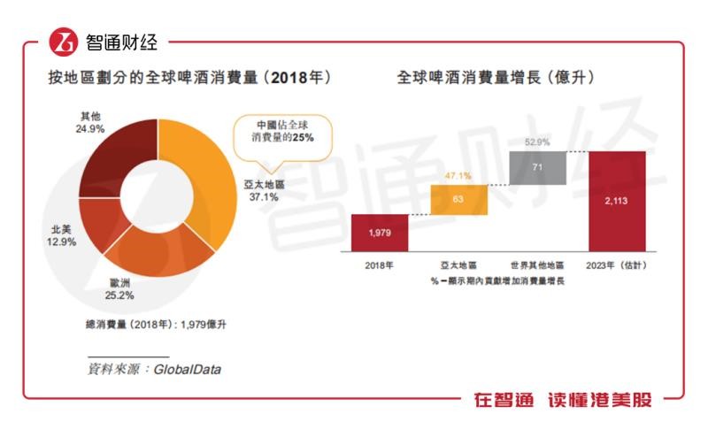 從行業(yè)角度來看,根據(jù)GlobalData的數(shù)據(jù),截至2018年,按消費量及價值計算,亞太地區(qū)是全球最大啤酒消費市場,也是全球啤酒銷量增速最快的地區(qū)之一。2018年亞太占全球啤酒銷量的37%,且預(yù)計2018年至2023年將貢獻(xiàn)全球啤酒銷量增幅的47%。