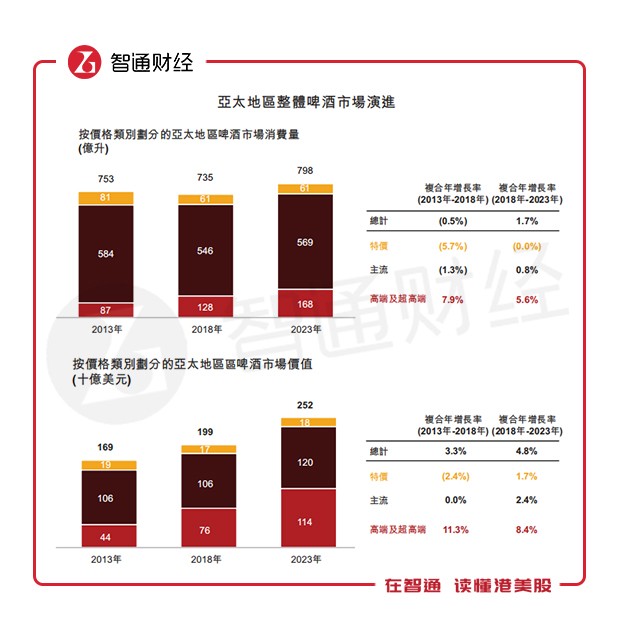 同時,亞太啤酒市場還表現(xiàn)出明顯的高端化趨勢。根據(jù)GlobalData的數(shù)據(jù),2018年至2023年,亞太地區(qū)高端及超高端啤酒的銷量會以5.6%的年均復(fù)合增長率增長至168億升,市場價值則以8.4%的年均復(fù)合增長率增長至1140億元。
