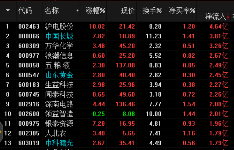 資金凈流入靠前: