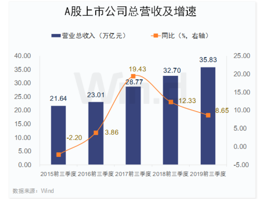 2019年前三季度A股上市公司合計(jì)實(shí)現(xiàn)營業(yè)總收入35.83萬億元,同比增長8.65%;實(shí)現(xiàn)凈利潤(備注:以下統(tǒng)計(jì)均為歸屬母公司凈利潤)3.19萬億元,同比增長6.77%。