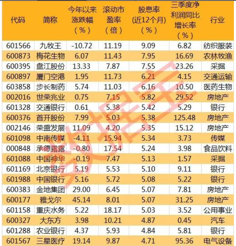 3、高股息率股票貴在穩(wěn)健、安全,長期看,即使市場出現(xiàn)長期調(diào)整,高股息個(gè)股也可以給投資者帶來穩(wěn)定的現(xiàn)金收入;目前高股息率個(gè)股的整體估值較低,根據(jù)以下條件篩選高股息率潛力股:1、滾動(dòng)市盈率小于20倍;2、2016、2017、2018連續(xù)三年股息率大于4%;3、最近12個(gè)月股息率大于4%;4、前三季度凈利潤同比增長。