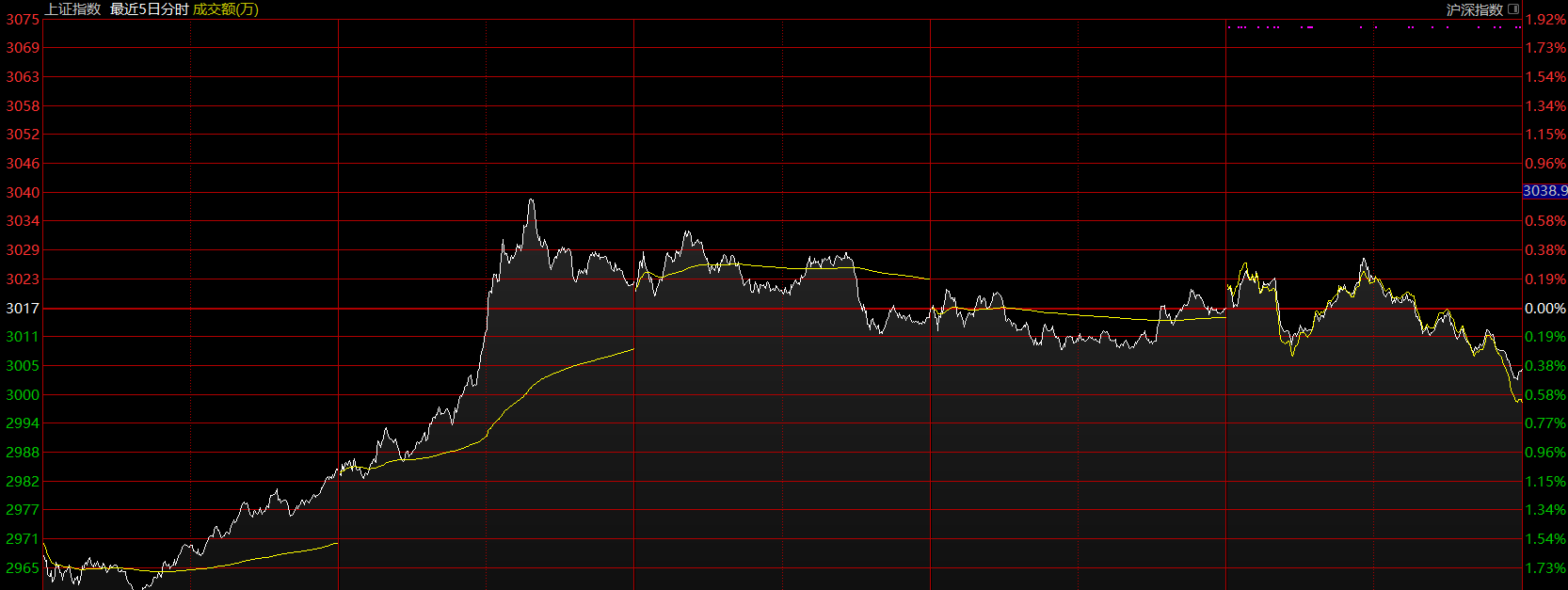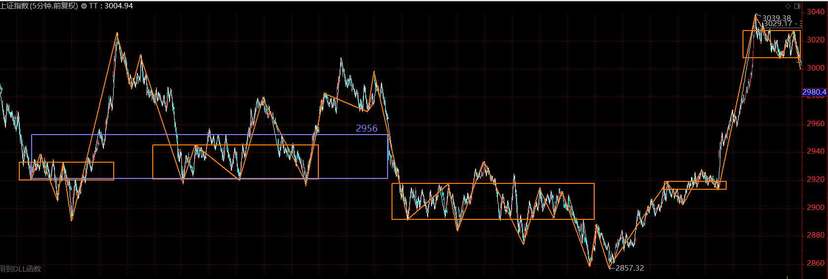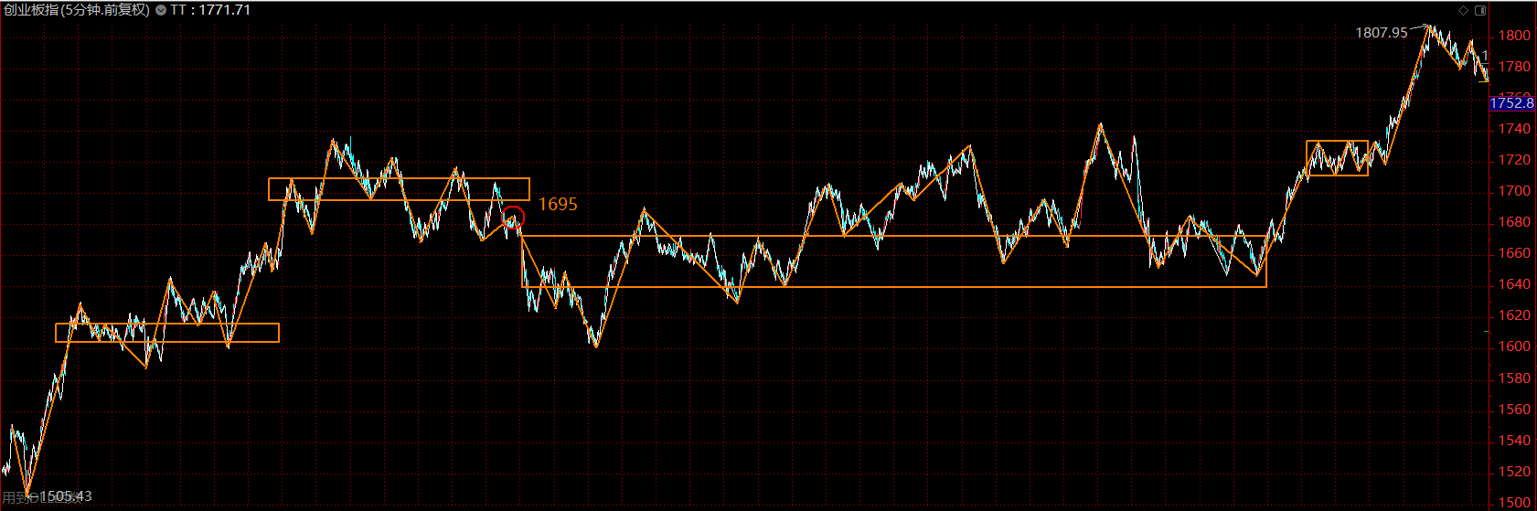 目前分析只需集中于這個五分鐘的上漲趨勢即可,上周如期做出了五分鐘上漲趨勢第二個中樞的雛形。前面幾天表現(xiàn)其實蠻超預期的,特別是科技股的逼空,A股似乎許久未見了。核心問題出在周五,周五有兩個點顯示出當下市場的外強中干,第一個在于周五早盤南京證券反包漲停時,市場資金的失衡,明顯看出科技股與券商股兩臺“抽水機”從前幾天的互相配合變成了互相傷害;這一段跳水直接將圖形破壞,強度大的新高背馳可以說已經(jīng)沒有了,那下午上拉無力后的跳水也就在情理之中。