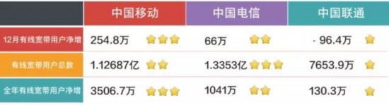 中國移動的12月、全年有線寬帶用戶凈增數(shù)均超過電信聯(lián)通總和的兩倍。中國移動在固網(wǎng)業(yè)務(wù)上采取超低價策略,但用戶總數(shù)仍與中國電信相差2000多萬,增速較前幾月也有所放緩,這也說明固網(wǎng)寬帶業(yè)務(wù)已經(jīng)觸到了天花板,發(fā)展新用戶越來越難。