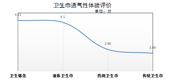 在本次主觀體驗(yàn)透氣性方面,衛(wèi)生棉條評價(jià)最高,平均得分4.11分;其次是液體材料衛(wèi)生巾,平均得分4.1分;藥用衛(wèi)生巾和傳統(tǒng)型衛(wèi)生巾透氣性評價(jià)稍遜,平均得分分別為3.96和3.94分。