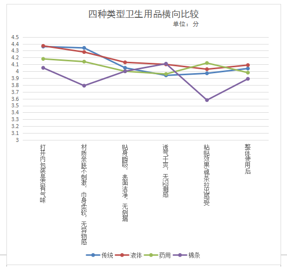 本次衛(wèi)生巾比較試驗(yàn)共招募150名目前沒有從事有關(guān)衛(wèi)生巾行業(yè)的年齡介于16-45歲之間的消費(fèi)者分別對傳統(tǒng)型衛(wèi)生巾、新型衛(wèi)生巾(液體材料衛(wèi)生巾)、衛(wèi)生棉條、功能性(藥用)衛(wèi)生巾四種類型商品進(jìn)行體驗(yàn)。要求體驗(yàn)消費(fèi)者對所使用的衛(wèi)生用品進(jìn)行1-5分的評價(jià)(1分最低,5分最高),主要體驗(yàn)內(nèi)容及感受如下: