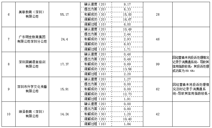 深圳英輔語(yǔ)言培訓(xùn)有限公司和深圳市升學(xué)文化傳播有限公司因經(jīng)營(yíng)者未將投訴處理情況記錄于消費(fèi)通系統(tǒng),導(dǎo)致兩家企業(yè)信用指數(shù)較低。其中深圳英輔語(yǔ)言培訓(xùn)有限公司投訴處理成功率為89.4%,因未記錄于消費(fèi)通系統(tǒng),極大地影響其信用指數(shù)和排名。深圳市消委會(huì)在此提醒各行業(yè)企業(yè),重視消費(fèi)者權(quán)益保護(hù)工作,及時(shí)處理消費(fèi)者投訴、與消費(fèi)者提早和解,嚴(yán)格按照消費(fèi)通系統(tǒng)要求記錄投訴處理情況,體現(xiàn)消費(fèi)維權(quán)信用對(duì)消費(fèi)者的消費(fèi)指導(dǎo)作用。