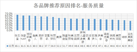 排名第一的是悅己堂,服務(wù)質(zhì)量推薦率為65.1%;其次是悅薈YUET 與明羽軒美容,推薦率均為61.5%。