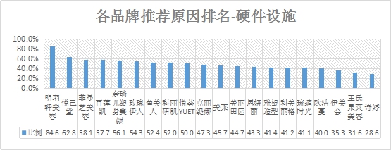 排名第一的是明羽軒美容,硬件設(shè)施推薦率為84.6%;其次是悅己堂,推薦率為62.8%;第三名是菲曼芝美容,推薦率均為58.1% 。